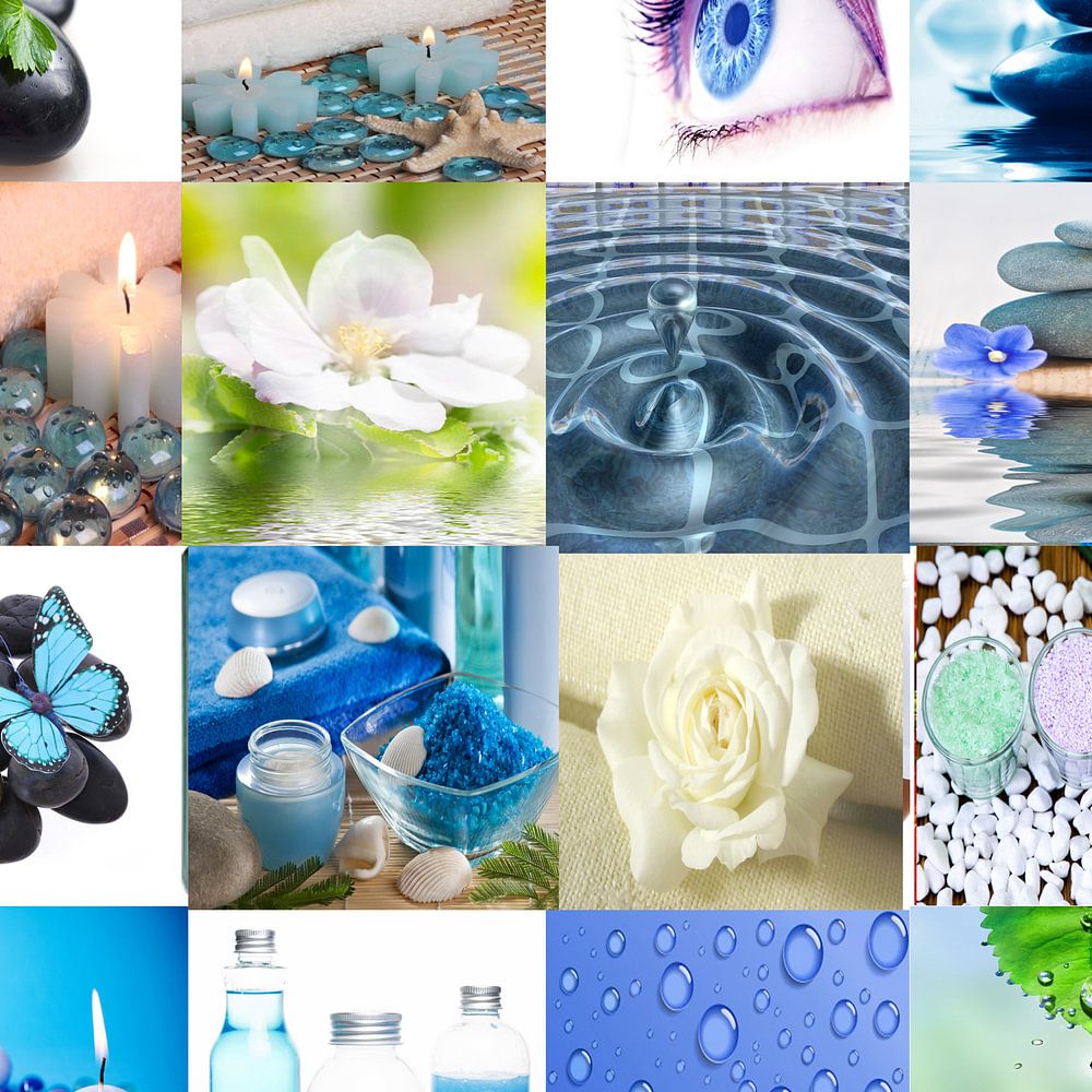 collage, badkamer, bloemen, waterdruppels, blauw, handdoeken,kaarsen