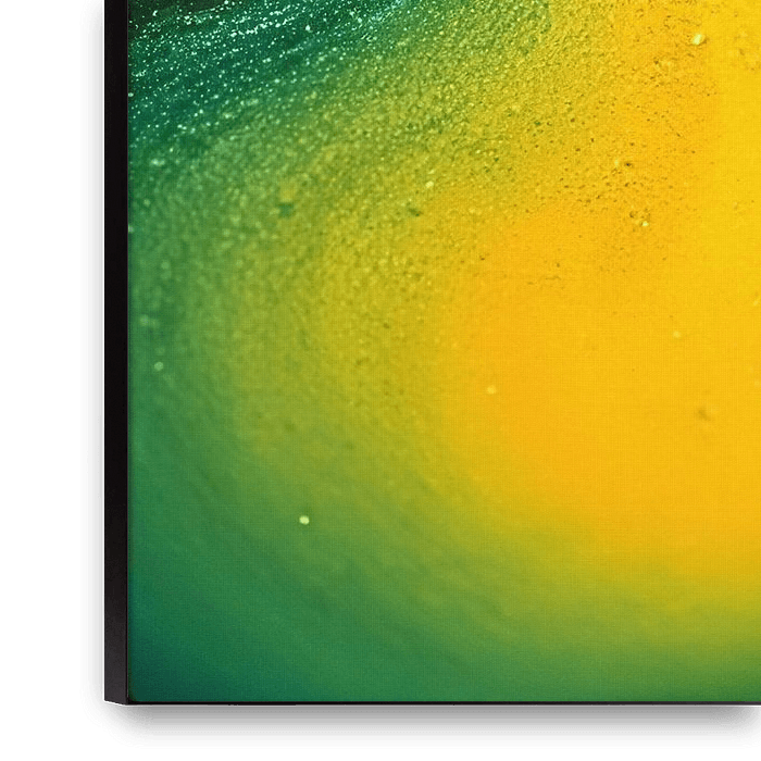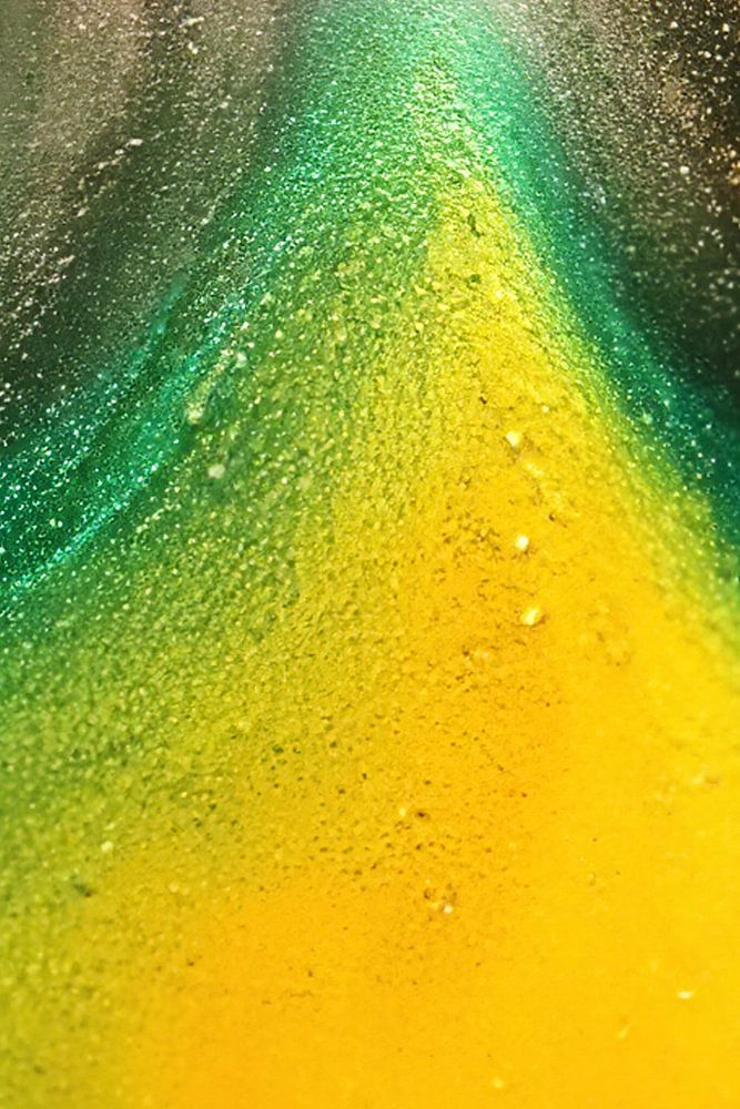 This artwork depicts a dominant cone of colour in radiant yellow with various shades of green, rising dynamically from the centre of the composition – like a glowing volcano of colour. Around the edges, shades of brown, pink and orange envelop the centre in soft, blending layers, whilst a subtle glittering effect or shimmer runs through…