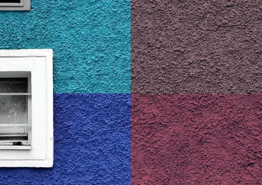 These blocks are in different colours. The surface of the wall is rough, which is visible through the texture of the plastered outer surface. The clear edges of the coloured blocks and the precise arrangement of the windows and vents give the picture a graphic and almost minimalist aesthetic, in which the interplay of colours and shapes is the main focus.