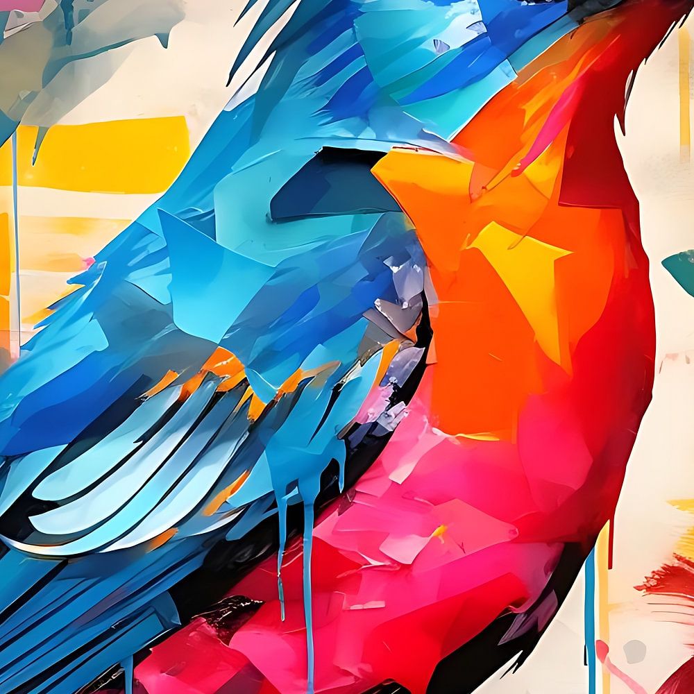In the vibrant painting, a colourful bird comes alive with a spectrum of brilliant hues. Its plumage is infused with a profusion of colours - cobalt blue, sunny yellow, deep green and vibrant red dance together in harmony. Each feather seems carefully painted, with attention to detail and shades that give the bird an almost tangible vibrancy. The bird exudes an aura of playful elegance, its splendour of colour being evidence of nature's wondrous diversity.
