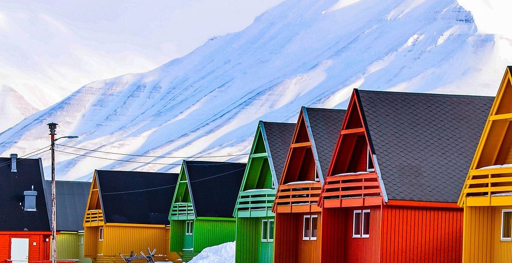 Longyearbyen Spitsbergen colorful houses in the town still early spring so with snowy mountains in the background. During a trip to this arctic area.