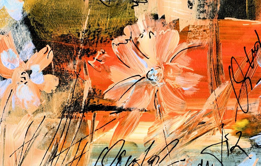 Flower picture in acrylic colours and graphic elements. A colourful and expressive picture for living room, hallway and office. It radiates optimism and serenity. flowers,blossoms,leaves
