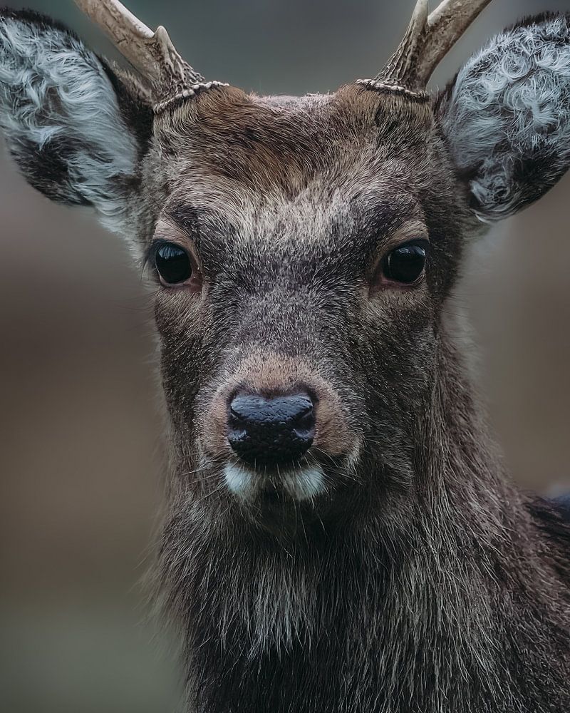 Photo of a deer with antlers. This photo was taken on a rainy day. After I met this friendly animal after a bike ride, the animal very curiously came to take a look at what I was doing