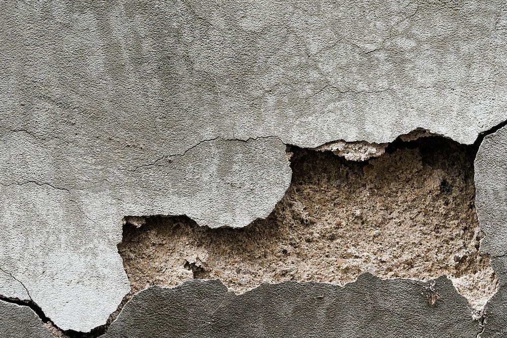 dilapidated peeling plaster on the old weathered facade of a dilapidated demolition house in the city of Magdeburg in Germany