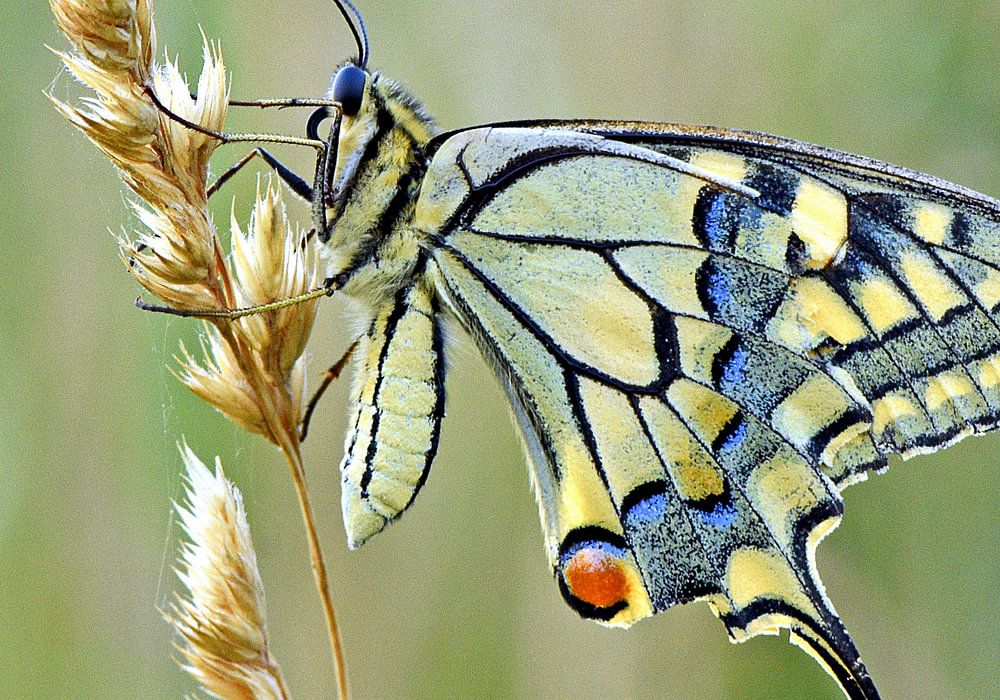 A swallowtail sits on a blade of grass