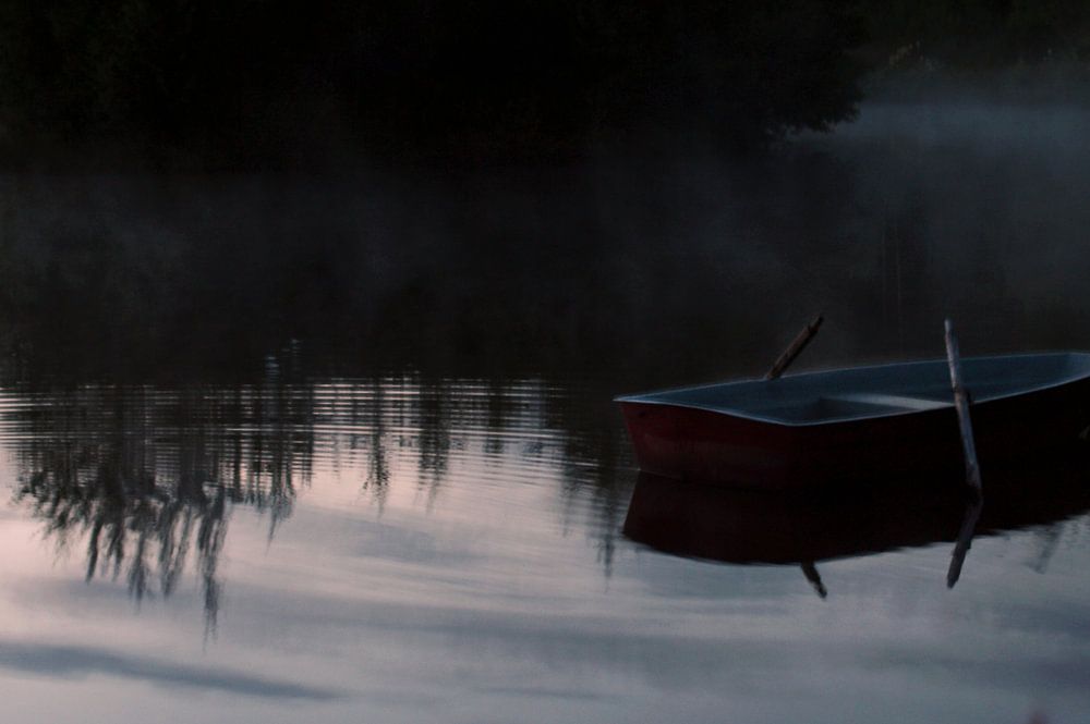 Rustig drijft een boot over een meer in zweden. Opgenomen tijdens zonsopgang op een vakantiedag in de zomer. Omdat dit foto gemaakt is met een langer sluitertijd lijkt het sprookjesachtig. Qua textuur lijkt het bijna een schilderij.