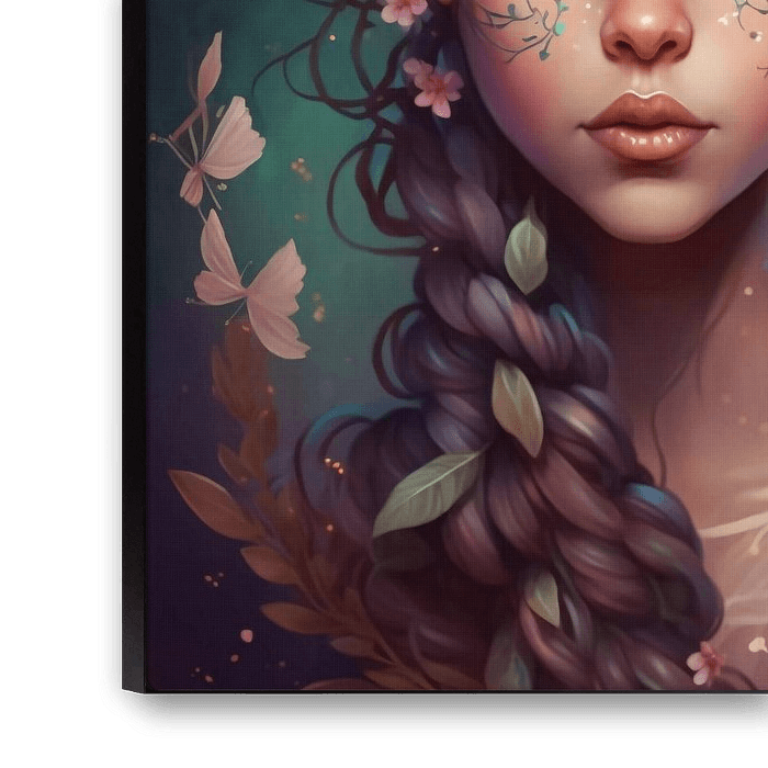 magical gorgeous fairy with braids and leaves and flowers in her.