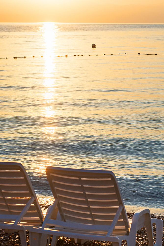 empty sunbed chairs at gravel beach moscenicka draga croatia, sunrise scenery. beautiful ocean in s by SusaZoom