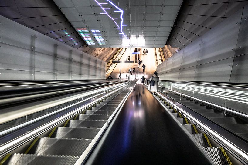 Buy the photo escalator metro station on the north south line Amsterdam by Eric van Nieuwland on canvas, ArtFrame, poster and wallpaper, printed on demand in high quality.