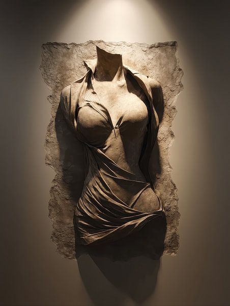 Fragment of Elegance depicts the graceful contours of a female silhouette, formed from folds of seemingly soft fabric — yet in reality crafted from hard, weathered material. The work subtly plays with contrasts: strength and softness, stillness and movement, past and present.