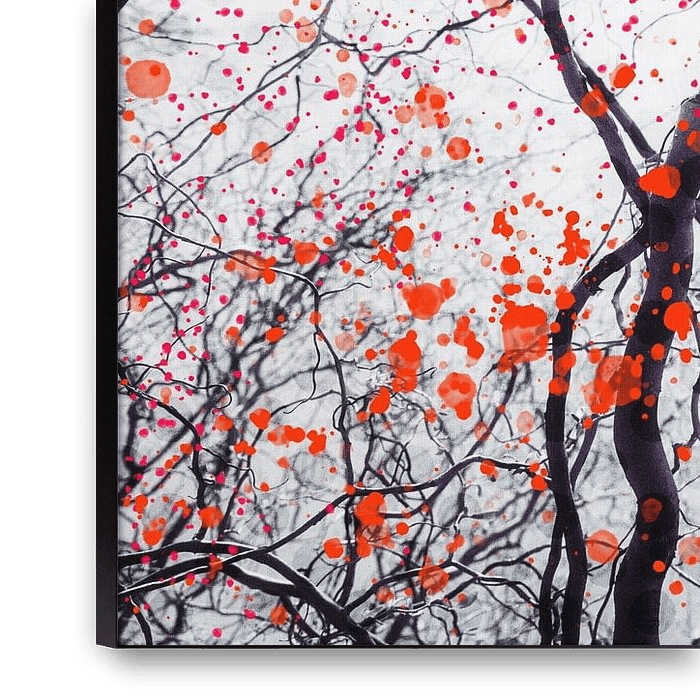 Photo of a beautiful tree in spring... with splashes of red and orange paint. Digital collage.