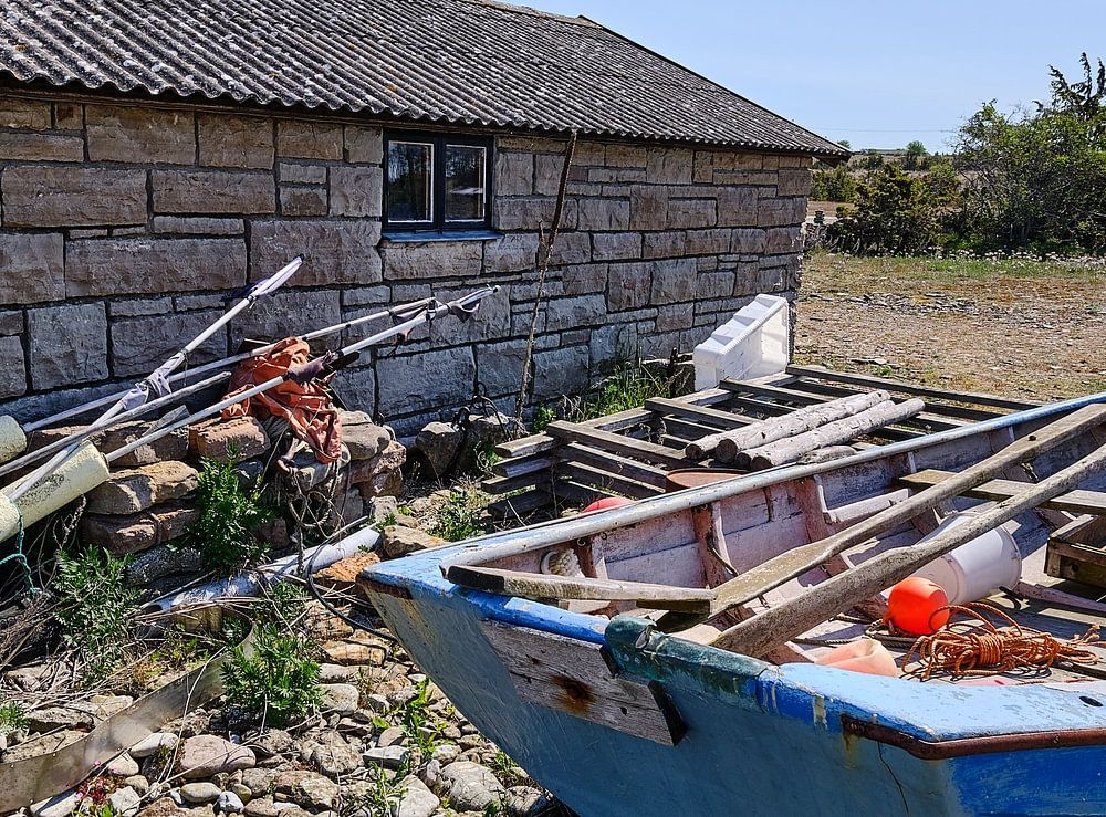 fisherman's house on öland with a boat next to it a blue sky in the background the house is built of local stones