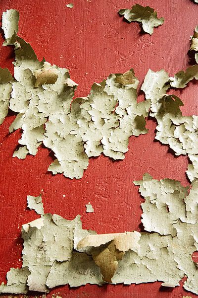 An old factory with steel structures has hidden details, like this flaking white paint on a red background.