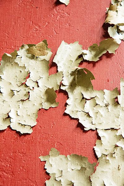 An old factory with steel structures has hidden details, like this flaking white paint on a red background.