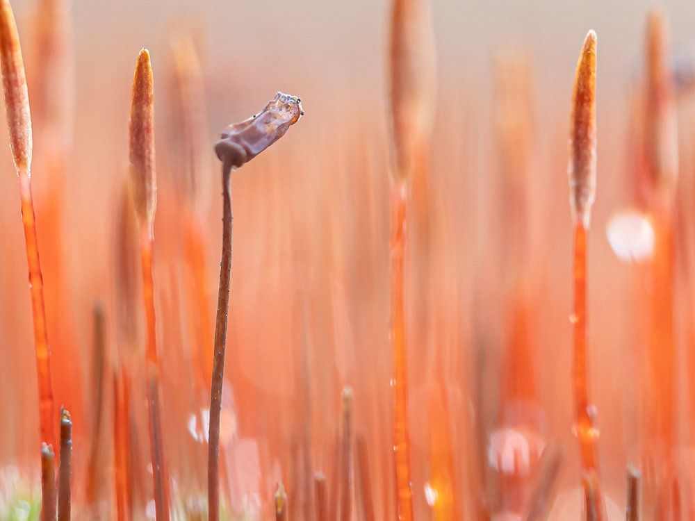 Flowering hair moss is a joy to behold. At first glance, lots of red thin stalks on a green mat of moss. But once put in macro, you see how beautifully everything combines. The fresh orange-red with sometimes a seed pod still from the previous year in between. With the light behind it, if the moss is still damp from the dew, you get beautiful circles of light and sparkles. Occurs in moorlands.