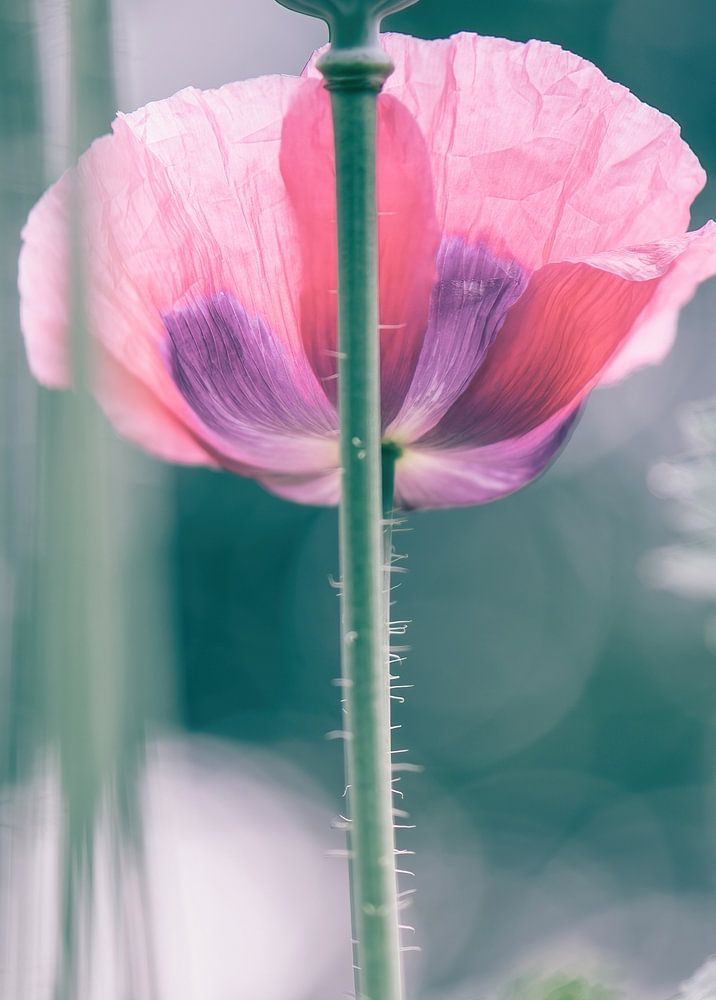 Closeup of a pink poppy among spent poppies, with a pastel bokeh background