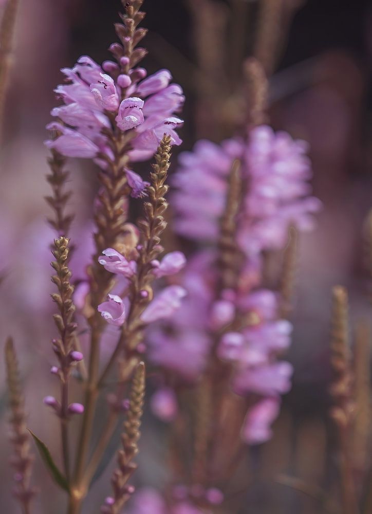 closeup of Physostegia virginiana, or hinge flower, with a brownish gray photo post-processing