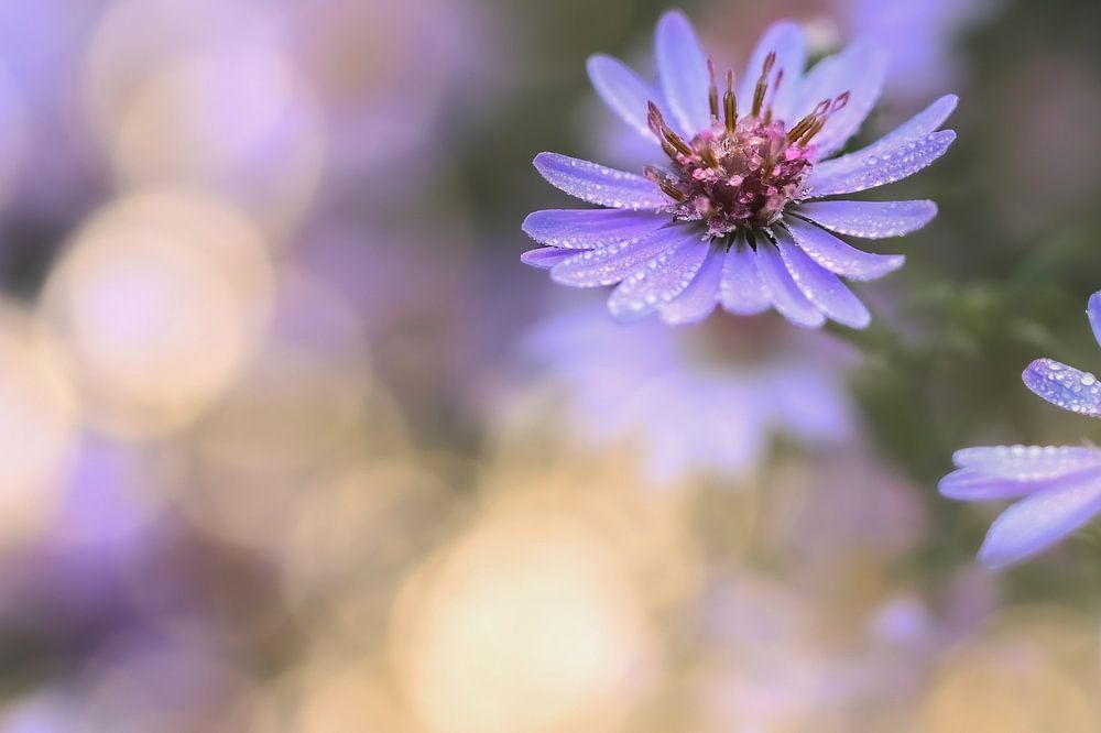 Close up of Symphyotrichum lanceolatum, or narrow aster, a purple autumn bloomer. The flowers are surrounded by sunny bokeh bulbs.