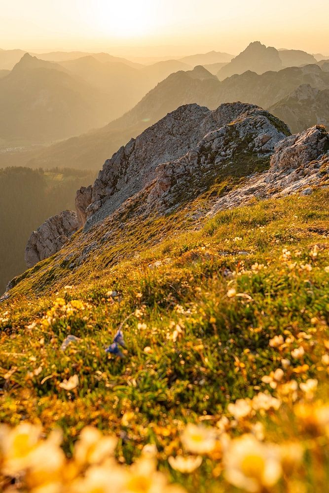 flowery view of the Tannheim & Allgäu Alps at sunset