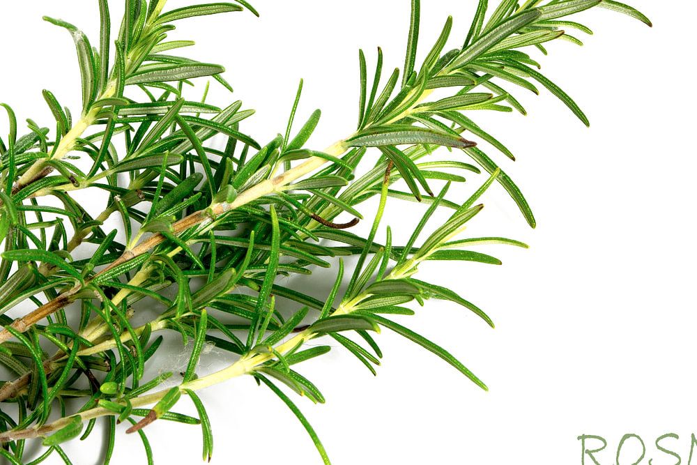 fresh green rosemary, Rosmarinus officinalis, isolated on a white background with sample text by Maren Winter