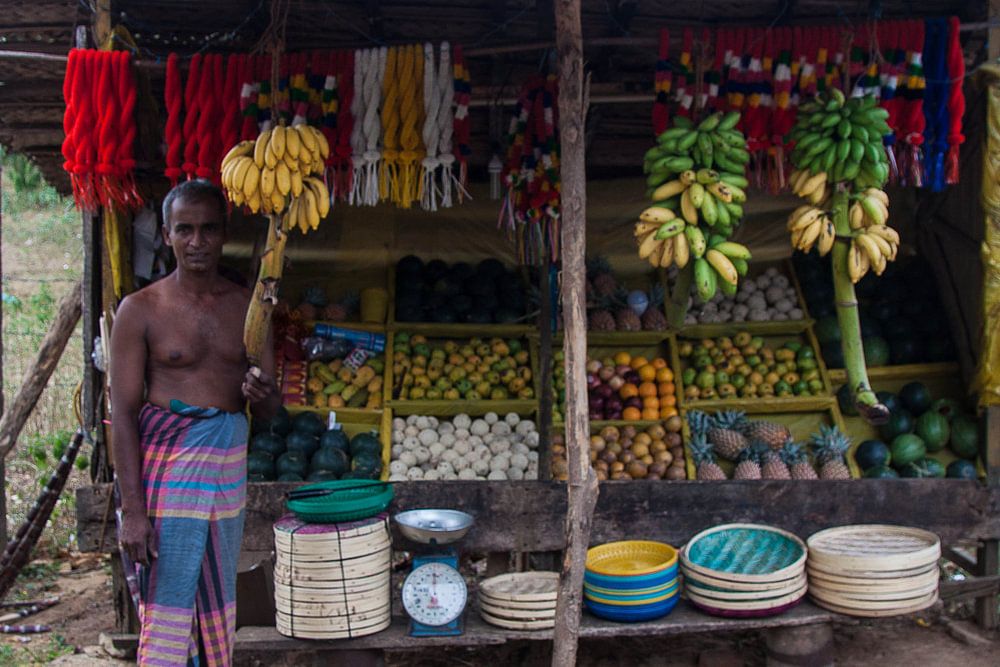 verkoper aan zijn fruitkraam, Sri Lanka.