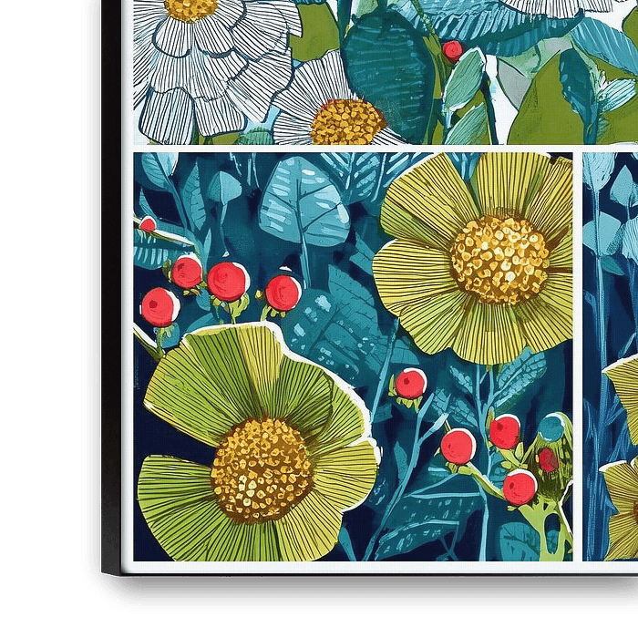 garden flowers illustration, layers template with white contour, gouache and acrylic pen digital imitation