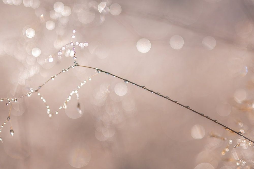 close up of super fine heather grass, completely covered with dew drops, glistening beautifully in the light of the morning sun