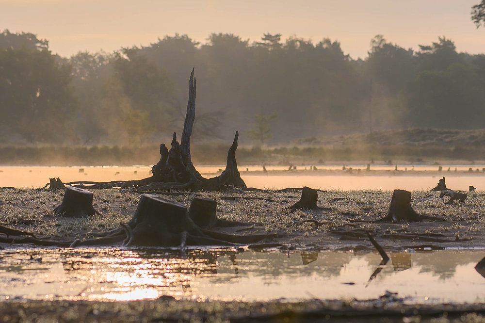 landscape on the Overasselt fens, early in the morning with the rising sun and mist over the water