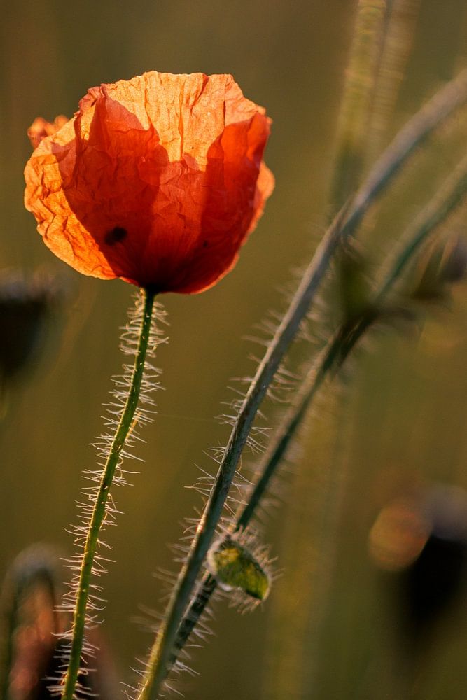 sunset during the golden hour in the meadow with a single poppy among the grain and various grasses with beautiful backlighting.