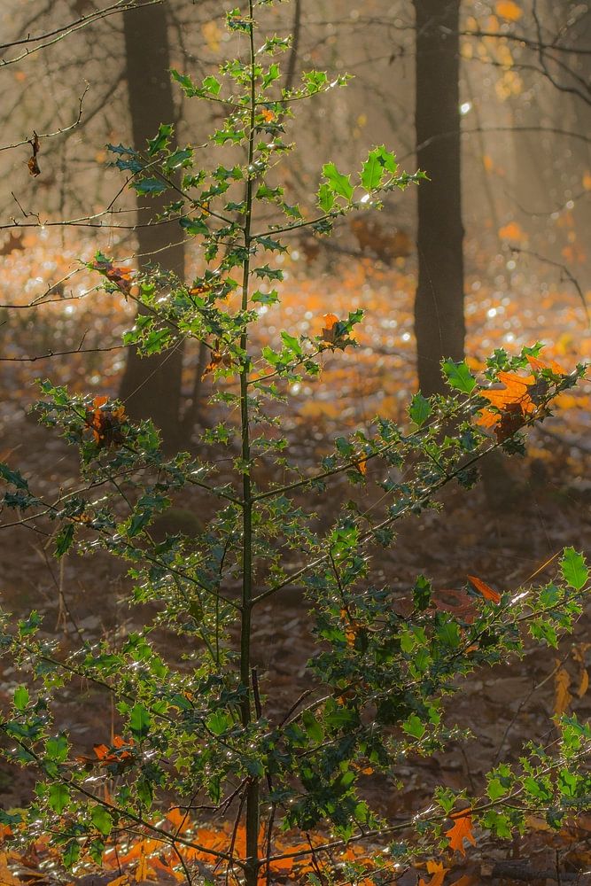 beautiful autumn morning with the sun's rays shining on a young holly bush