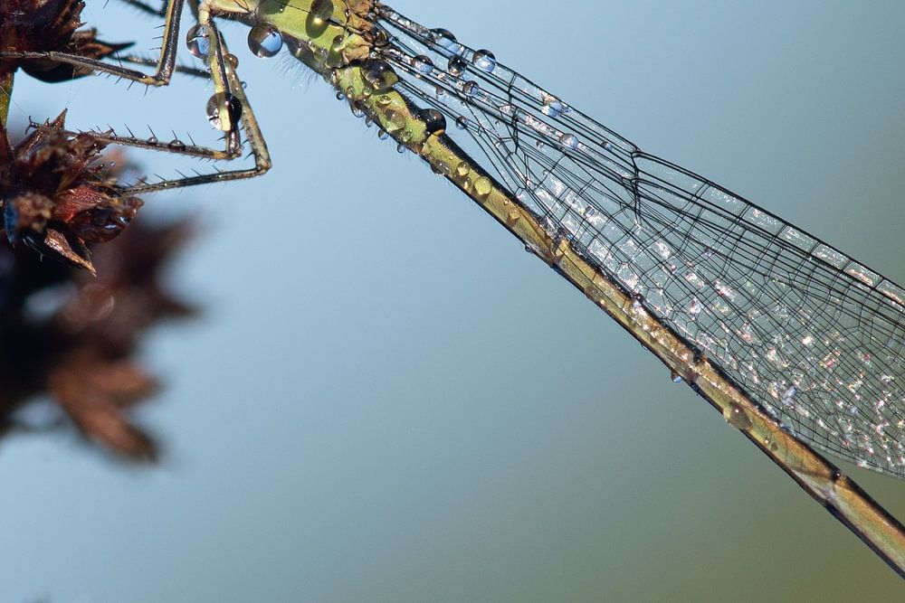 About "green dragonfly covered with beautiful dewdrops in morning light"