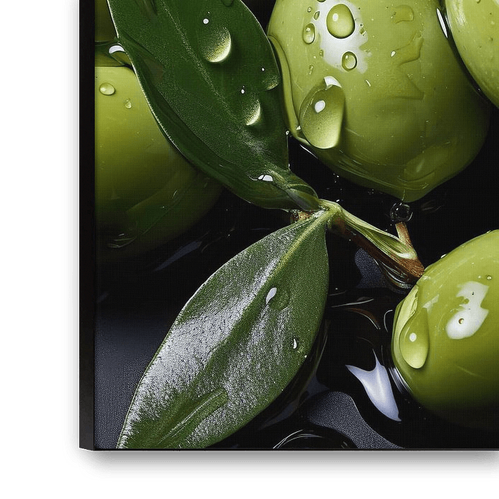 In this poster, green olives shine like vibrant gems. The intense, fresh shades of green create a visually appealing contrast. Each olive has a perfect, rounded shape and a juicy appearance reminiscent of freshness. The composition highlights the lush green colour, with the olives perhaps casually scattered or rather arranged. This visual celebration of green olives awakens the senses and reflects their flavourful and vibrant presence.