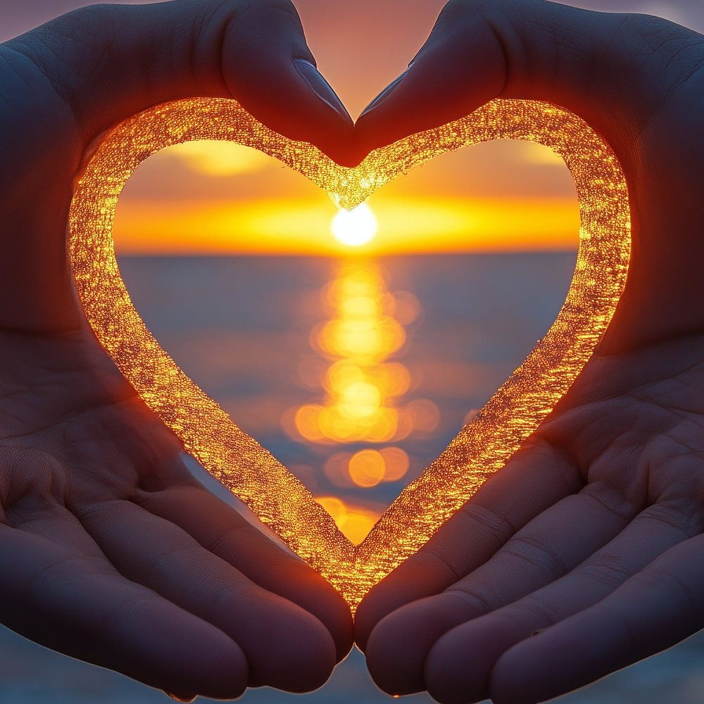 About "hands shaping a heart around a soft, warm sunset on the horizon"
