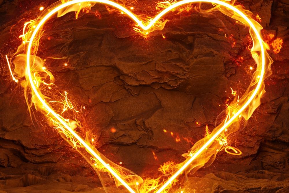 Buy this digital art artwork heart on fire and blazing lights rocky environment by Besa Art as a reproduction on canvas, ArtFrame, poster and wallpaper, printed on demand in high quality.