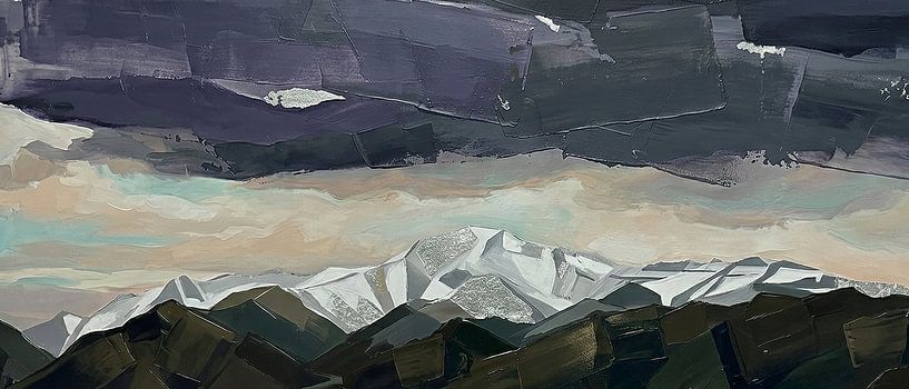 Immerse yourself in the magical atmosphere of the Alps at sunset. This striking work of art captures the moment when the sky glows in deep shades of violet and grey, bathing the snow-capped peaks of the mountain range in a cool, mysterious light.