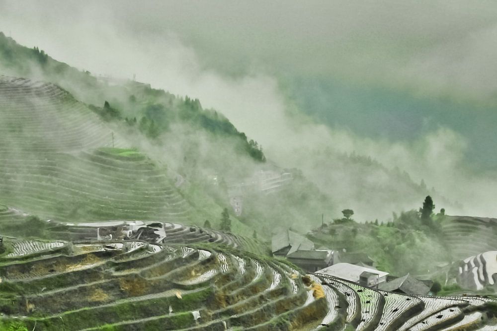 house on the hill is a hill of clouds and fog. Misty autumn landscape with rice terraces. China, Yangshuo, Longsheng