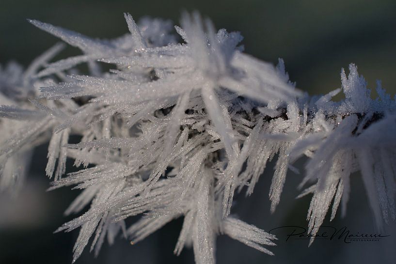ice crystal was drawn in the Ardennes. in and temperature of -8 degrees and a sunny day with not a cloud in the sky.The crystal formed around plug wire or better called quenching wire.The photo was taken with Nikon 3300 with macro lens 50 mm.