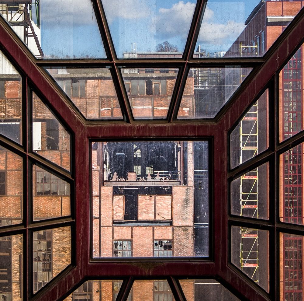 This window stands on the place where once a track ran to the other building. This gives the framework back its shape.