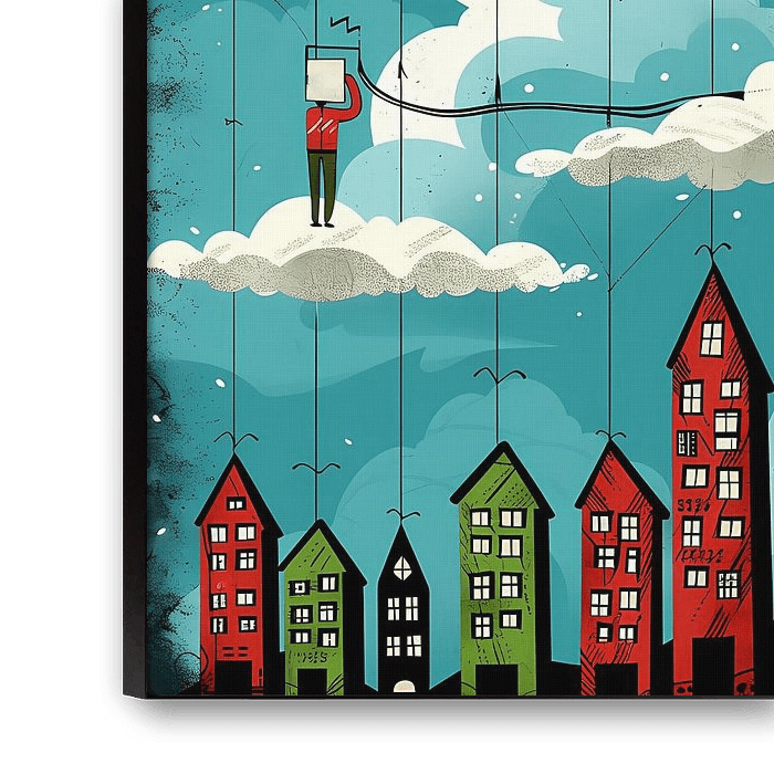 This enchanting artwork takes you to a world where the boundaries between reality and fantasy are blurred. Floating figures balance on cables between skyscrapers, while holding mysterious devices. The dreamy atmosphere invites reflection and wonder, while the vibrant colours and detailed elements hold your attention. A unique piece that adds a touch of magic to any space.