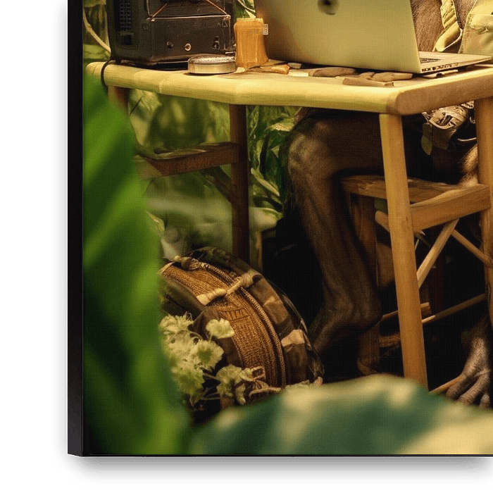 Deep in the jungle, a monkey sits at a laptop with a serious expression, as if he were a digital nomad on safari. Surrounded by lush greenery, leather suitcases and an old-fashioned lamp, the scene looks like a bizarre fusion of wilderness and the modern working world. The contrast between technology and nature is staged here with a…
