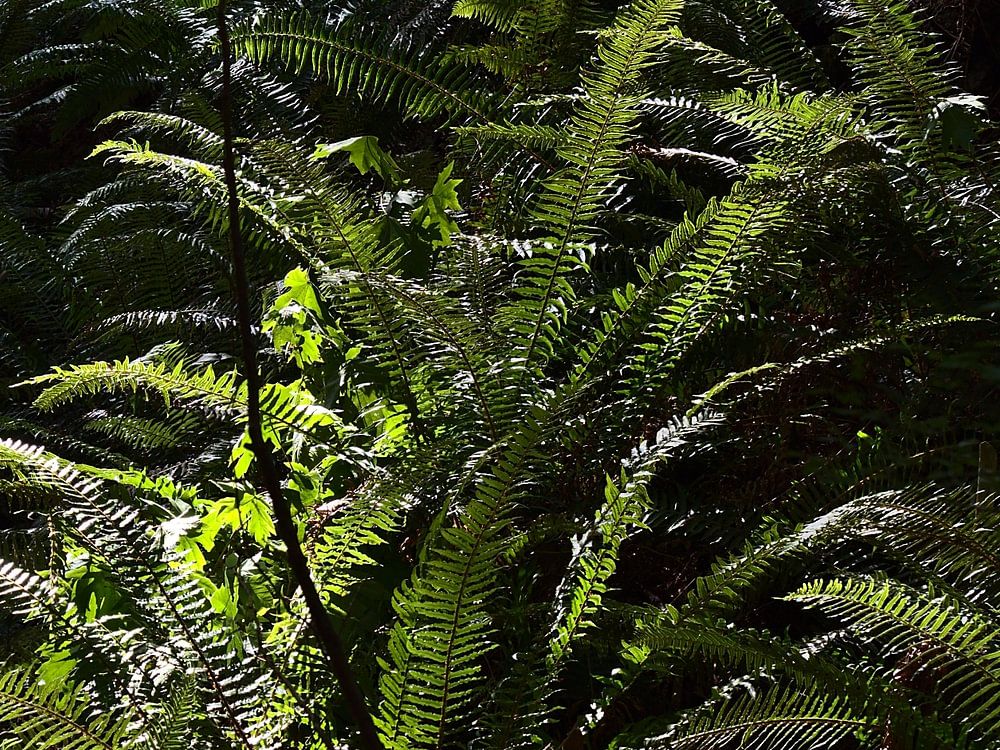 View of the leaves of the fern West American sword fern (Polystichum munitum) glowing green in the sunshine in a dense, shady temperate rainforest on the coast of the Pacific Ocean in Lighthouse Park near West Vancouver, British Columbia, Canada.