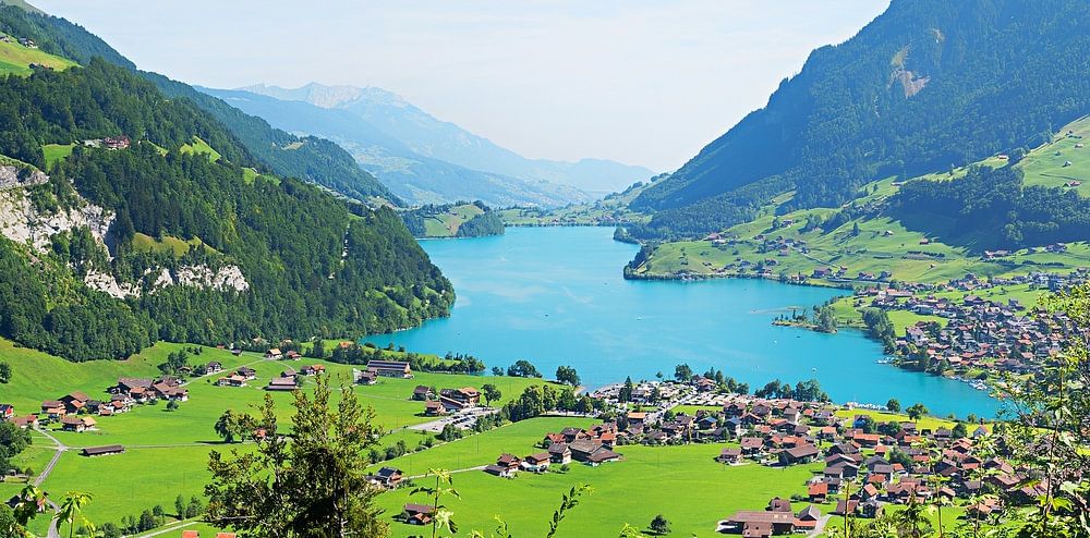 view from mountain pass Brunig to landscape lake Lungernsee, canton Obwalden, switzerland
