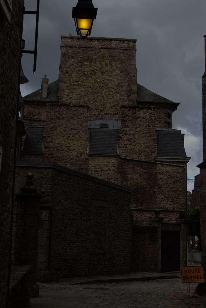 Lamp still burning very early in the morning on the streets of Dinan, France