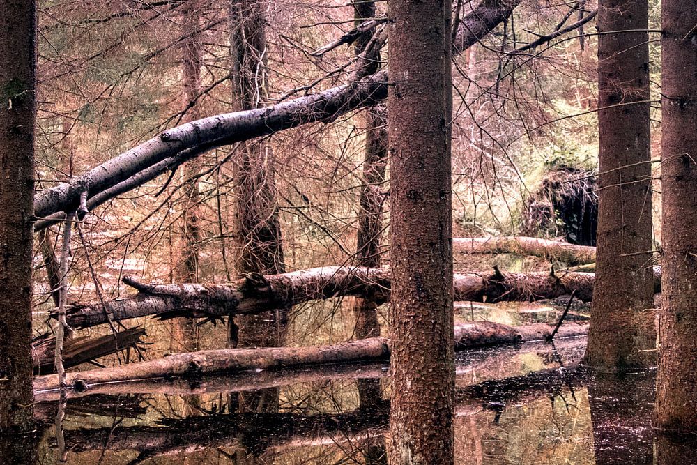 This is a very dark woods in the rain. Fallen trees make a beautiful triangle in the reflection.