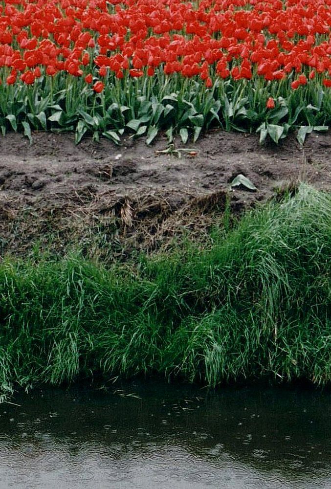 Deze foto is gemaakt op Urk in april. Zo'n foto kan alleen maar in Holland gemaakt zijn: een lammetje in de lente, tot aan de horizon tulpen en regendruppels in de zon.