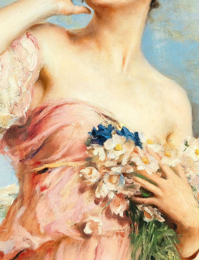 This model stands outside in nature, with a bunch of wild flowers pressed against the bosom in your hand.