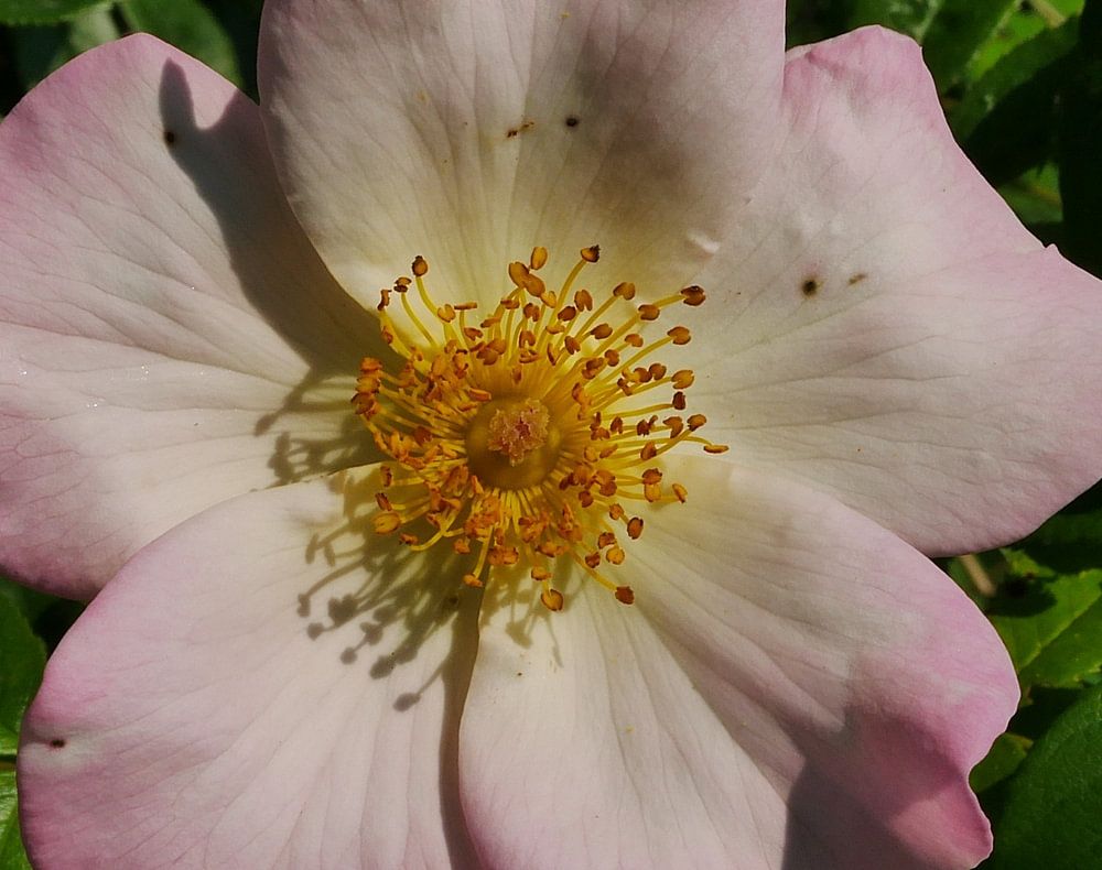 White botanical rose with a pink pattern. Just beautiful, a bit of colour in the house. Normally we just walk past a plant like that. We have to learn to look again.