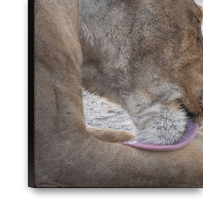 Mother lion and cub are licking each other in utter adoration. photographed in etosha. namibie