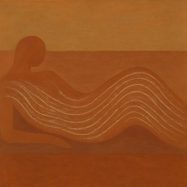 This minimalist abstract oil painting invites the viewer to stillness and imagination. Warm earth tones and soft, flowing shapes create an abstract composition that exudes tranquillity and balance. Subtle white pinstripes add a playful textural touch and give the work a layered, almost poetic depth.