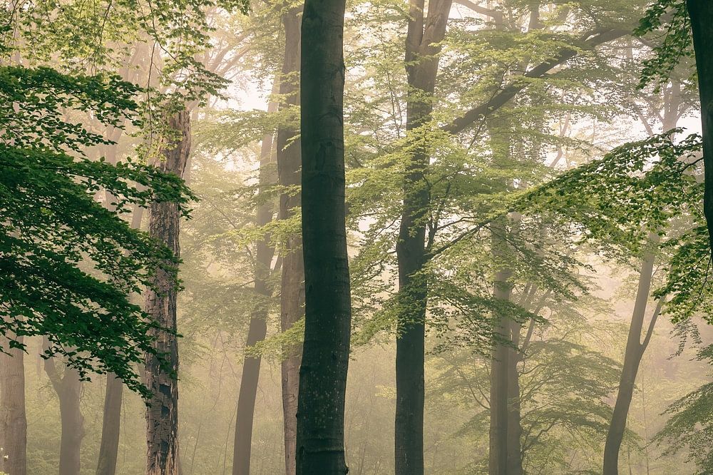 landscape in Renkum, Gelderland, where the morning light shines between the trees, and the fog creates a wonderful atmosphere